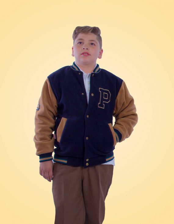 Casaca unisex, de polar forrada, azul, con mangas beige, cuello alto y puños tejidos. Uso deportes desde Jardín Infantil a IV medio. Tallas desde la 2 hasta la XL.