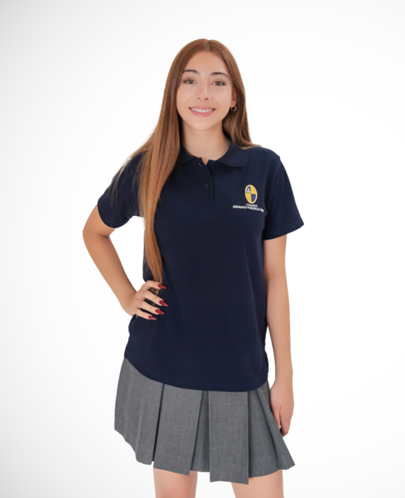 Polera mujer, de piqué, manga corta, azul, cuello tejido con tapeta y logo bordado. Uso uniforme de 4° básico a IV medio, tallas desde la 10 hasta la XL.